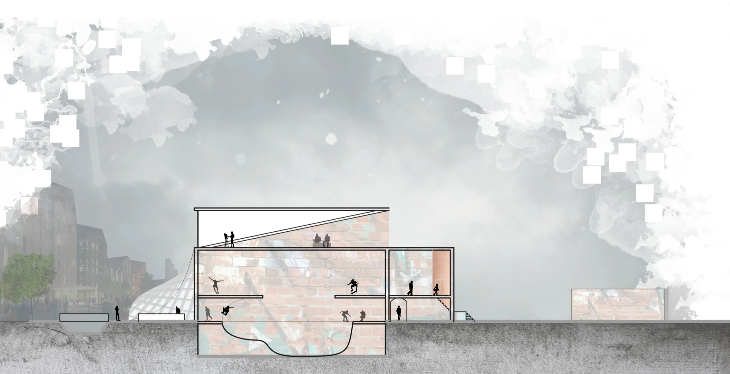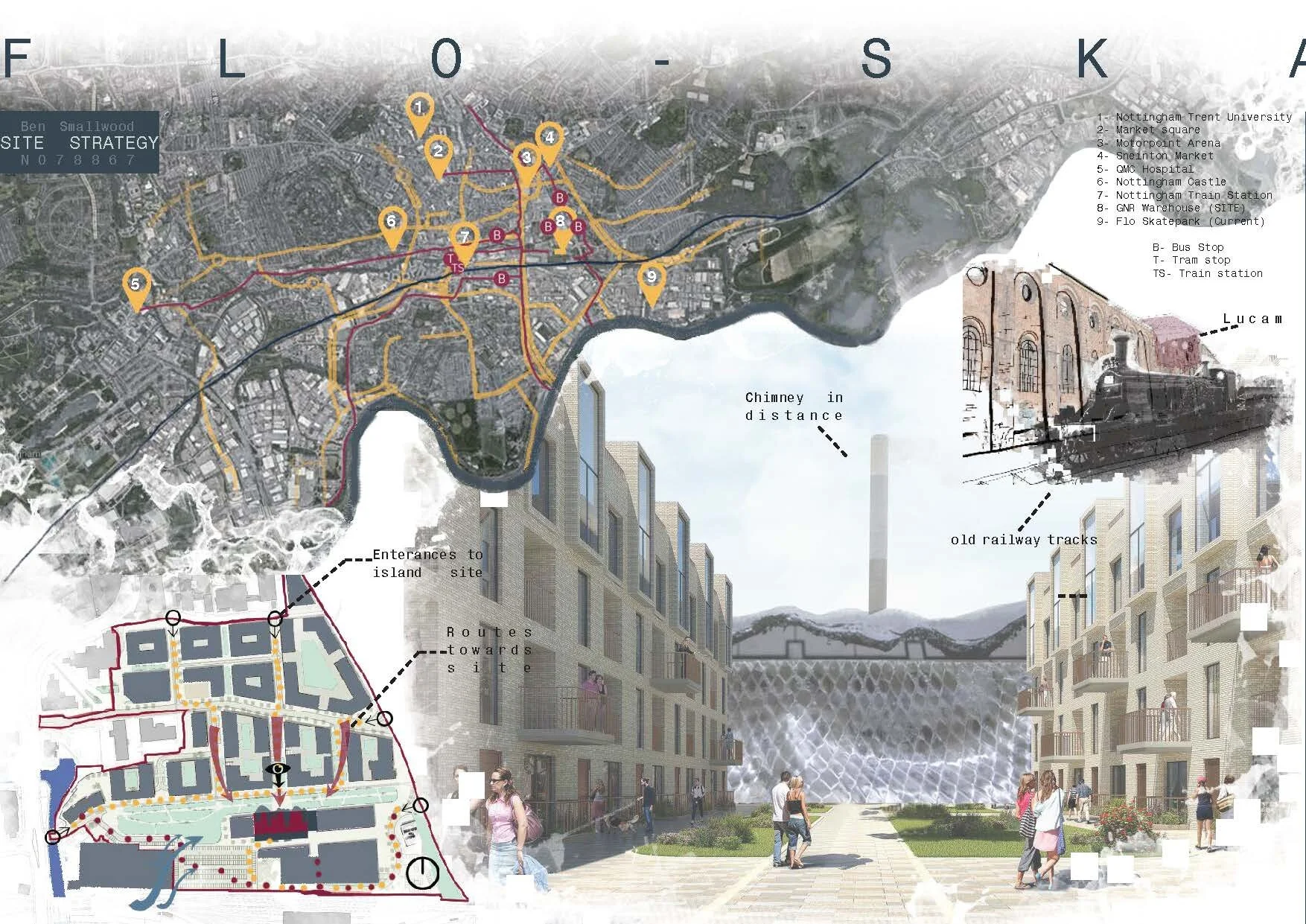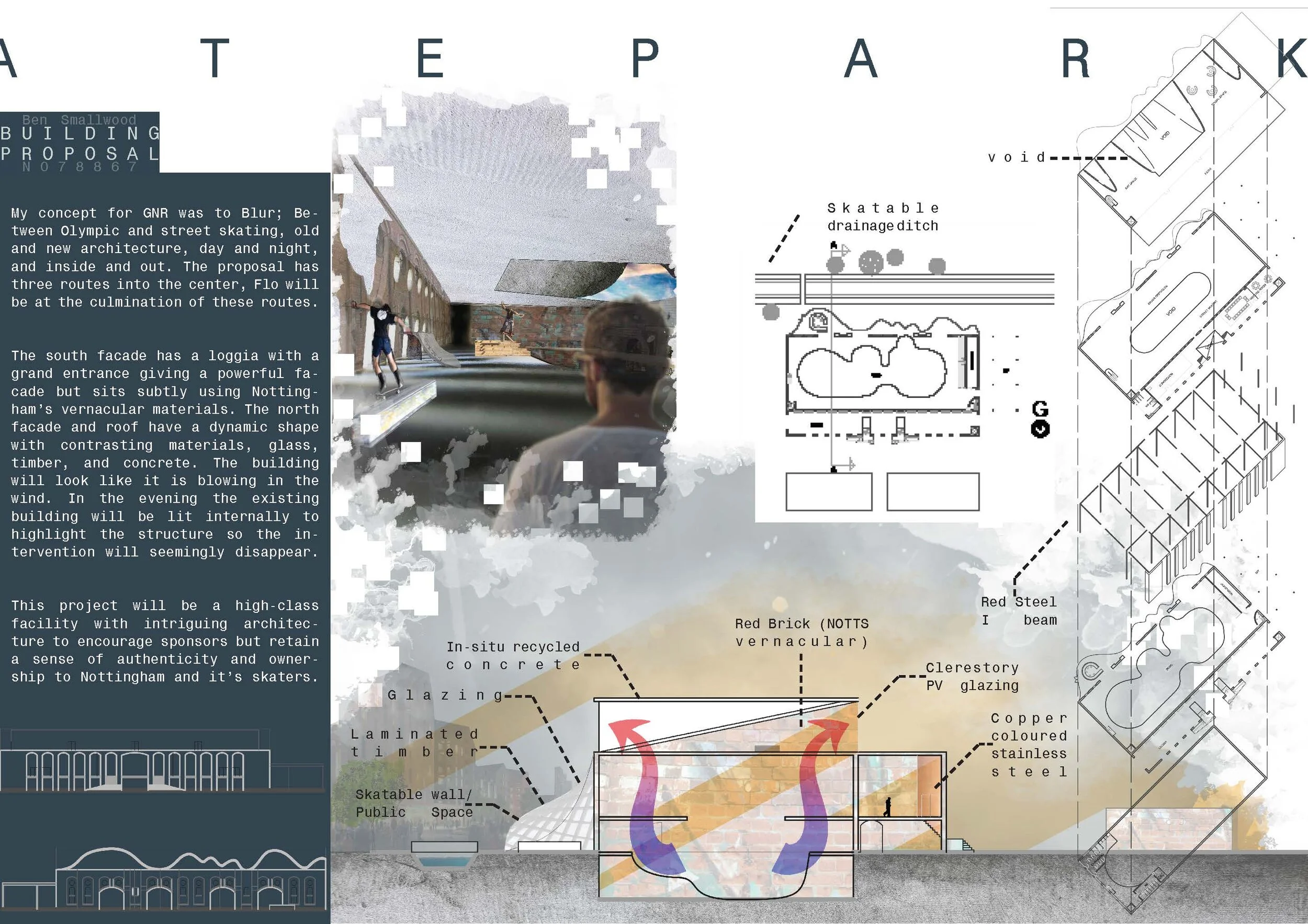 A live project, rehoming an independent company in Nottingham, Flo Skatepark, to an identified future development including a grade 2 listed railway warehouse. The design was to include 2 seperate phases, an intervention to allow the company to inhabit and use the space until final funding and construct is completed. A permenant plan to allow the company to progress and facilitate the growing sport on an international scale.
